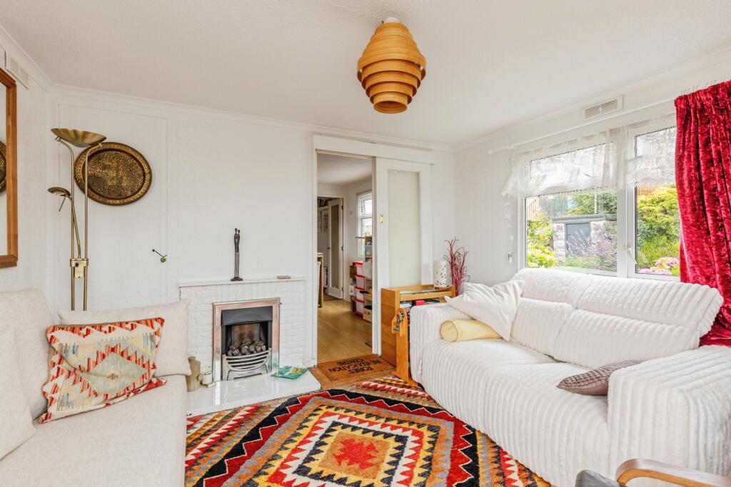 The home offers a bright and inviting living space, with new patio doors that open directly onto a raised decking area, perfect for soaking up the sea views, dining outside or simply relaxing with a book. Inside, there’s a modern kitchen, spacious lounge with a traditional living flame gas fire, and a second bedroom ideal for guests or a home office.