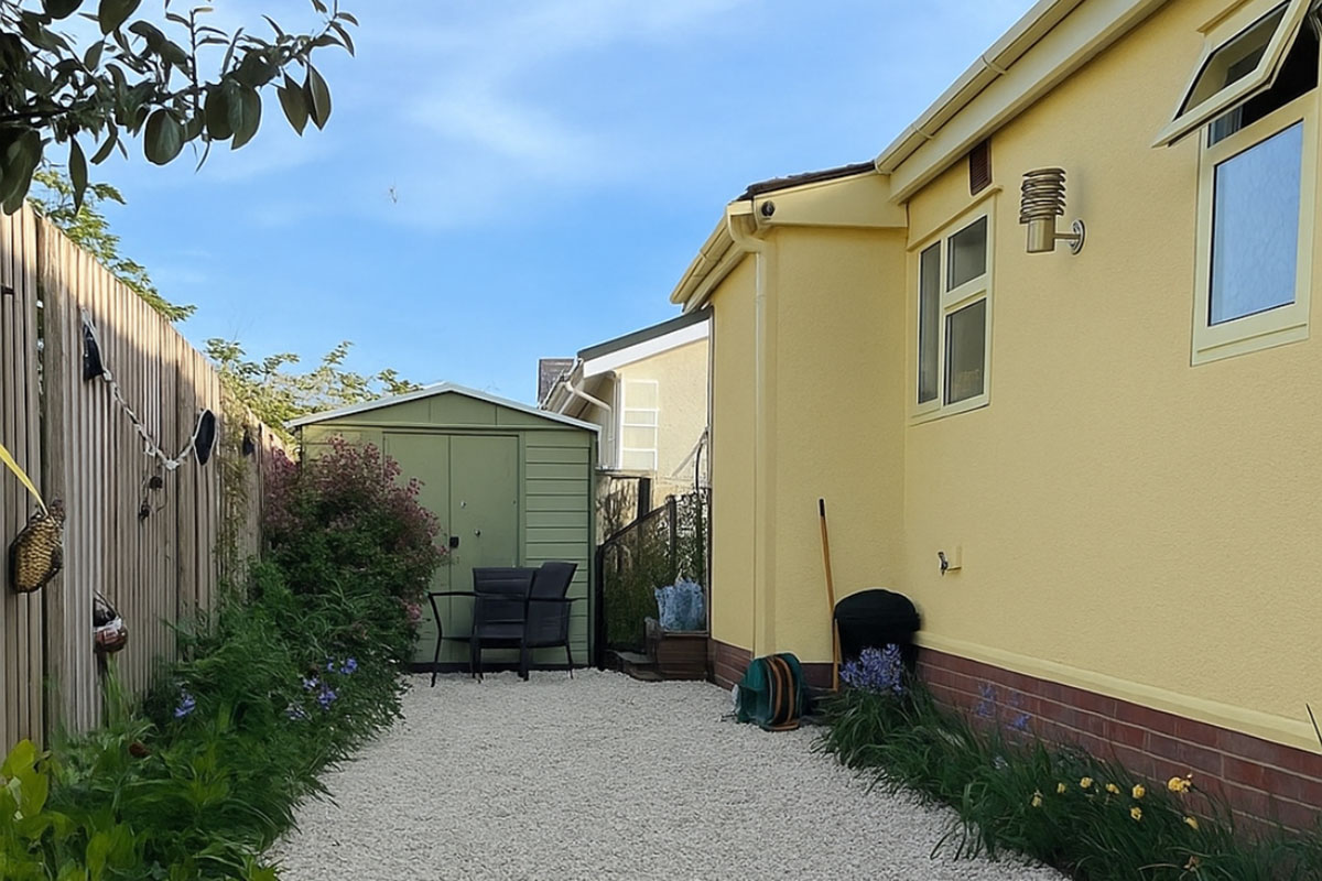Tucked away in the top corner of the park with private parking alongside, this double-unit home features two bedrooms, one bathroom, and a bright, open-plan layout. The rear garden is a real highlight — fully enclosed and landscaped with Cotswold cream chippings, mature borders and a generous decking area complete with a four-seater hot tub included in the sale. There’s also a handy tin shed offering extra storage.