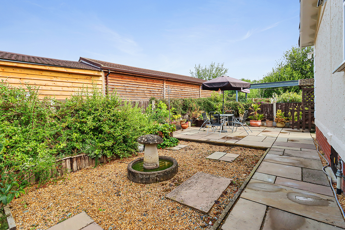 Outside, the enclosed garden is beautifully arranged with raised beds, a patio, small pond, and a large shed with electricity. The driveway offers parking for two cars, with additional outside sockets and a tap.